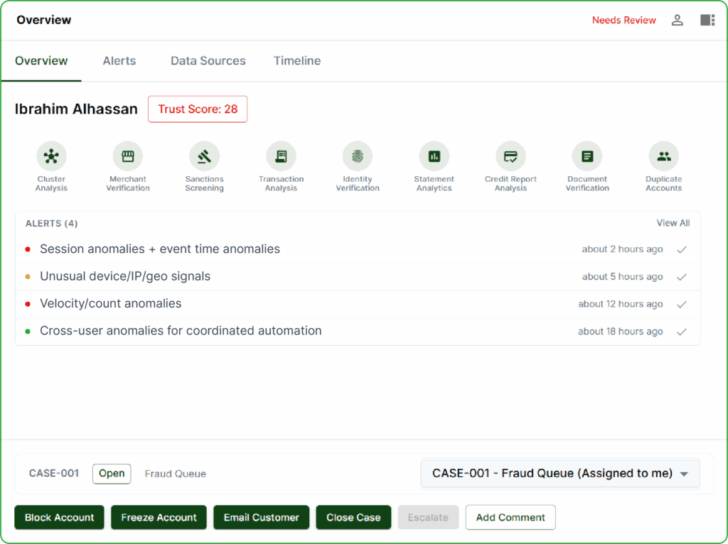 - Centralized fraud, AML, and compliance workflows